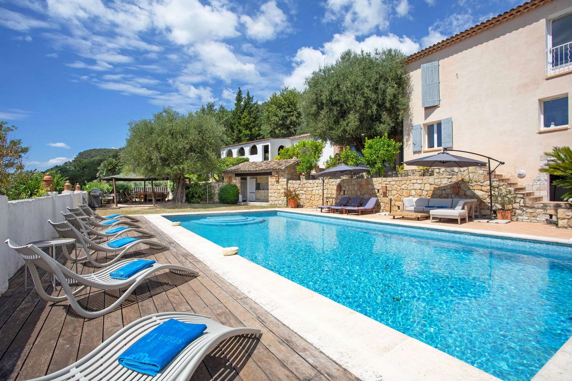 Situated on the heights of Châteauneuf de Grasse, this holiday villa will dazzle you with its incredible panoramic view over the Bay of Cannes. The Mediterranean garden features a 12-metre swimming pool, a large shaded gazebo with barbecue, a fully-equipped summer kitchen and a table tennis table. Fully air-conditioned, the property comprises a 4-bedroom main house and an independent guest house with a 5th bedroom.