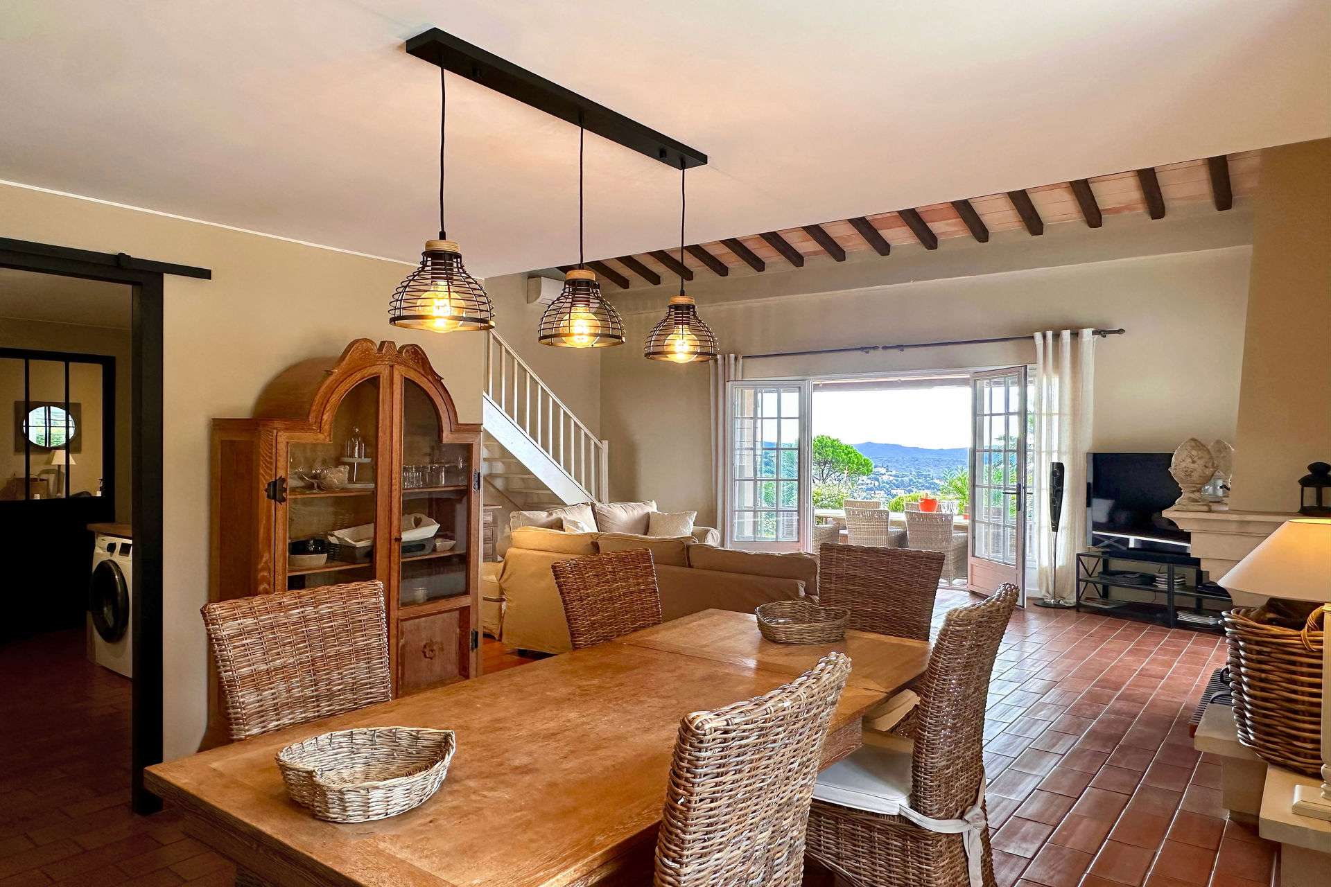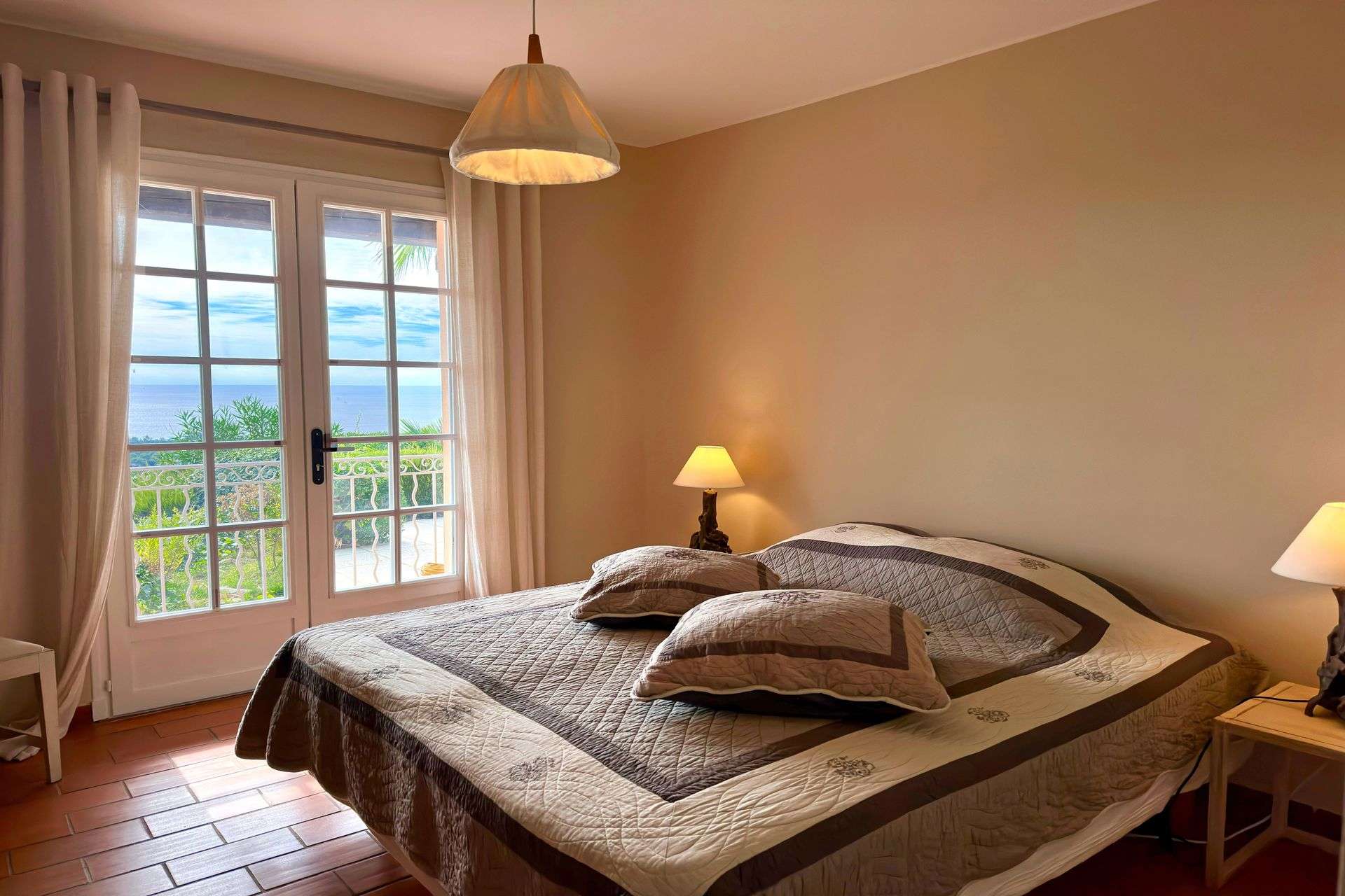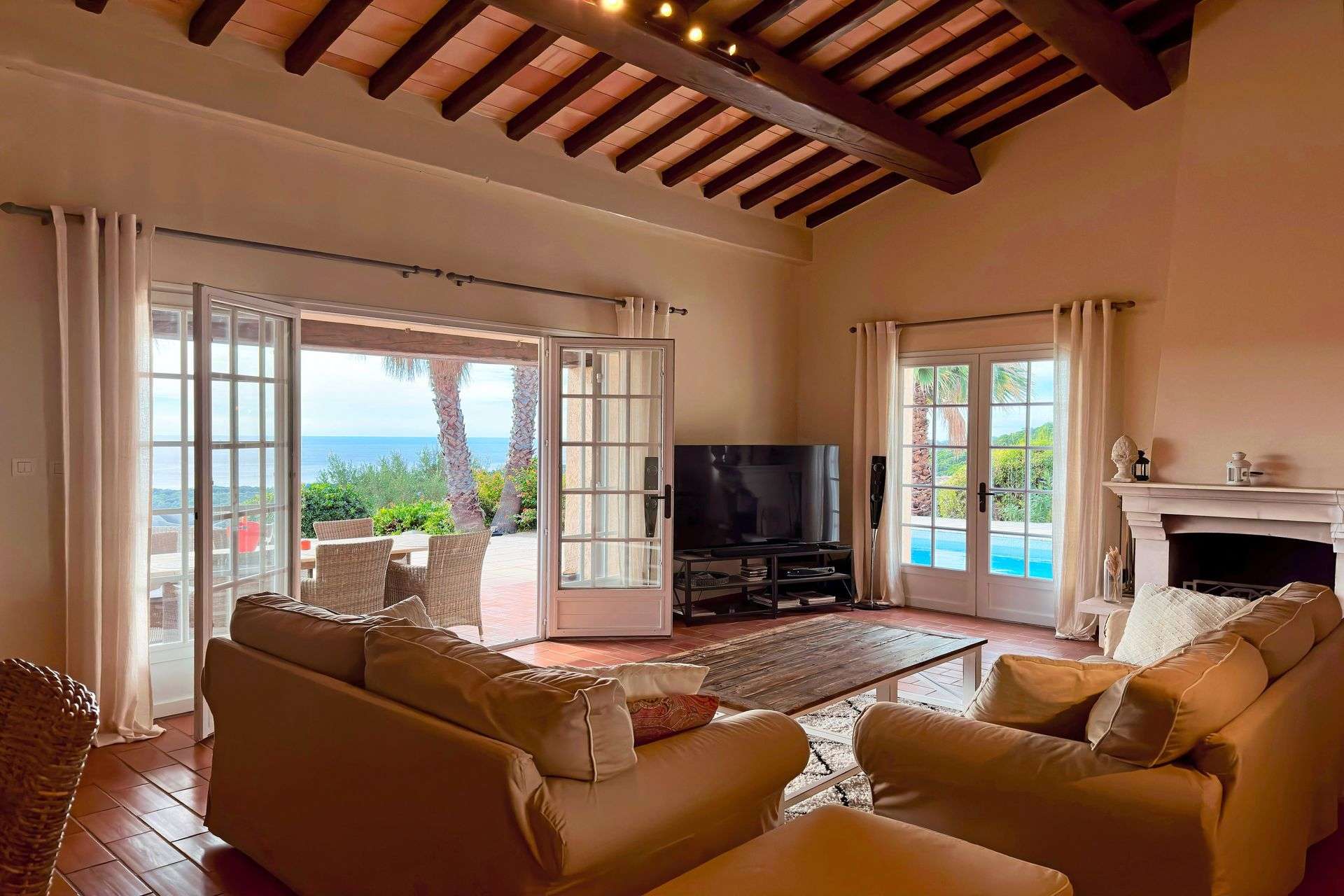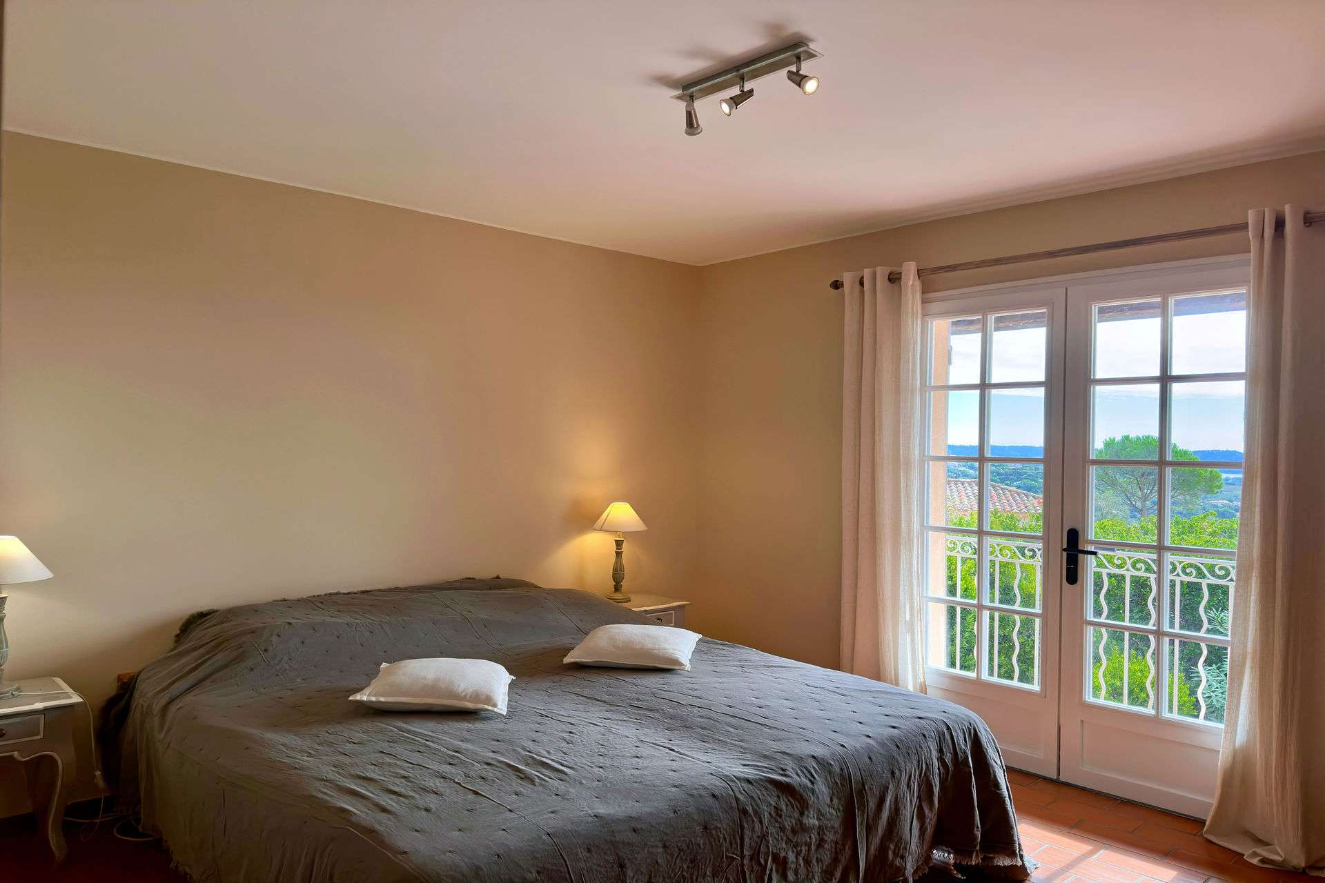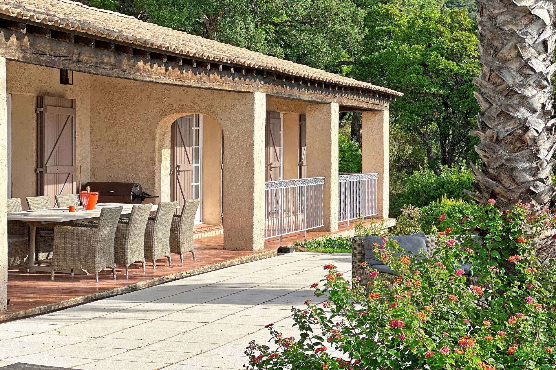 Surplombant la baie de Croix Valmer sur une colline calme et préservée, cette villa de vacances climatisée bénéficie d'une superbe vue panoramique sur la mer.