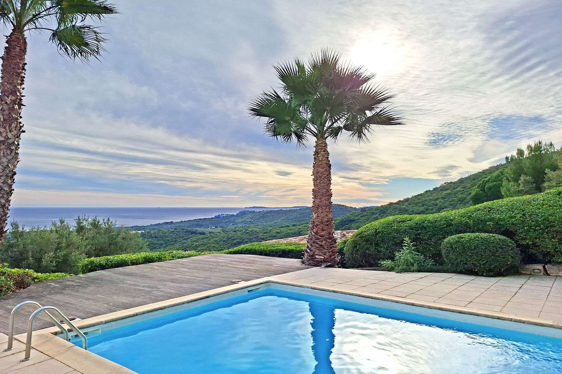 Surplombant la baie de Croix Valmer sur une colline calme et préservée, cette villa de vacances climatisée bénéficie d'une superbe vue panoramique sur la mer.
