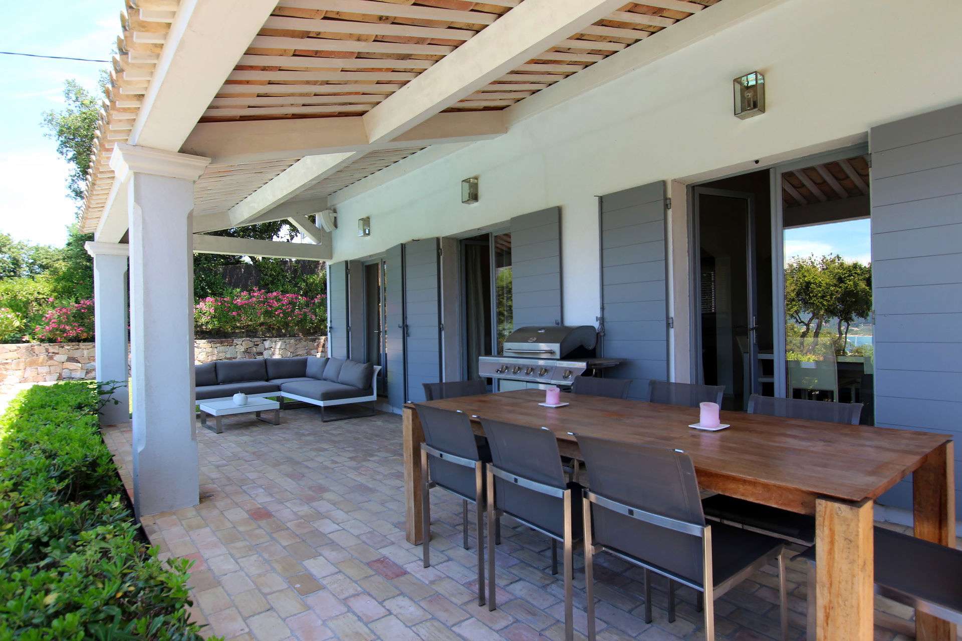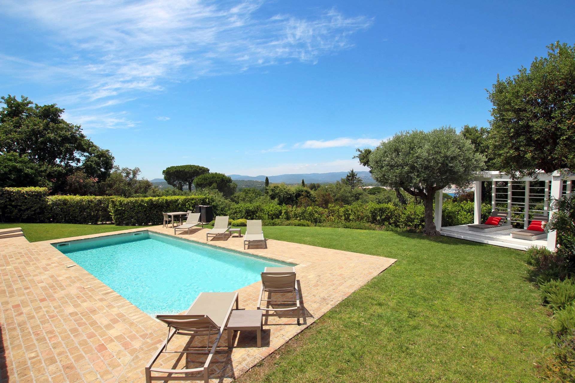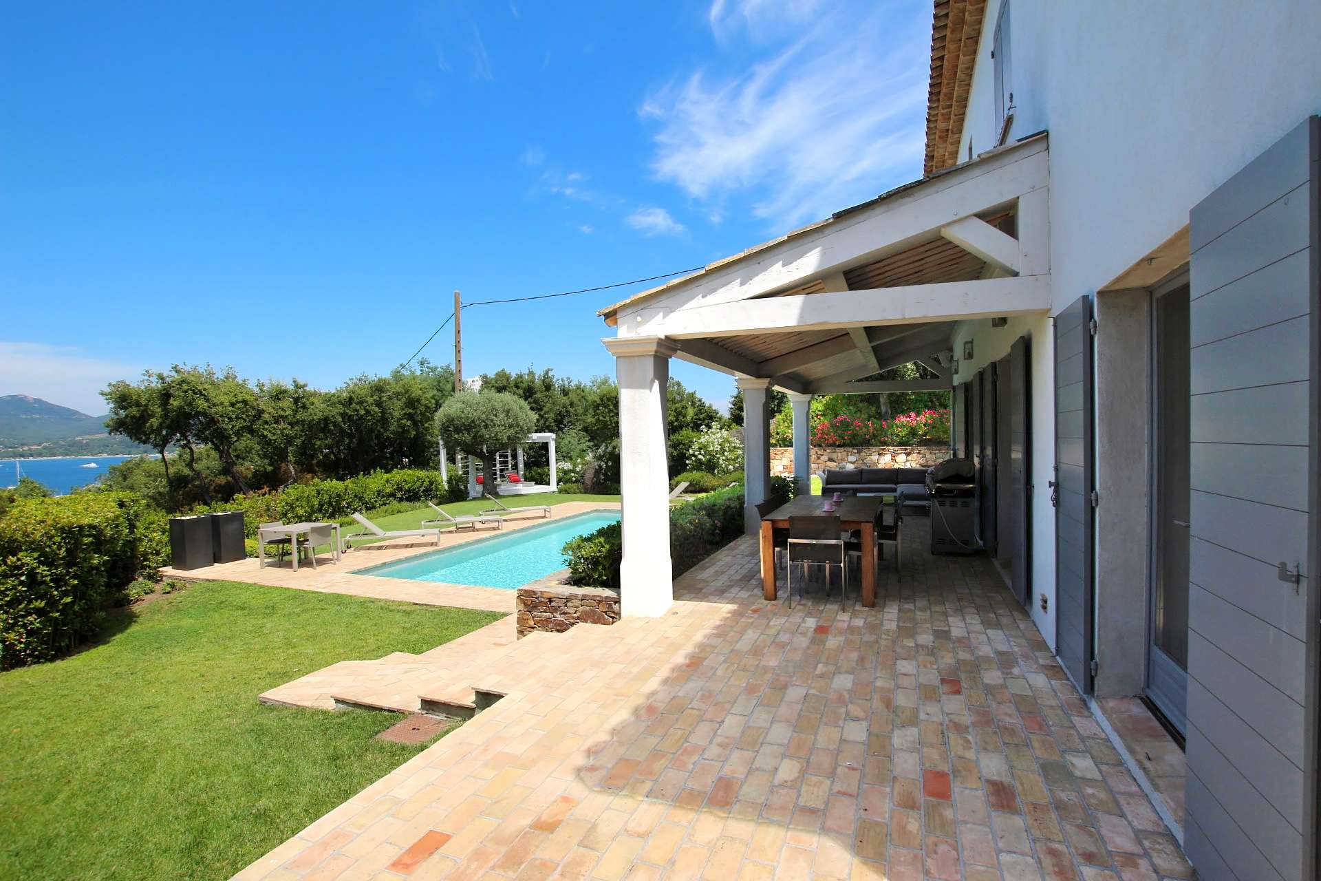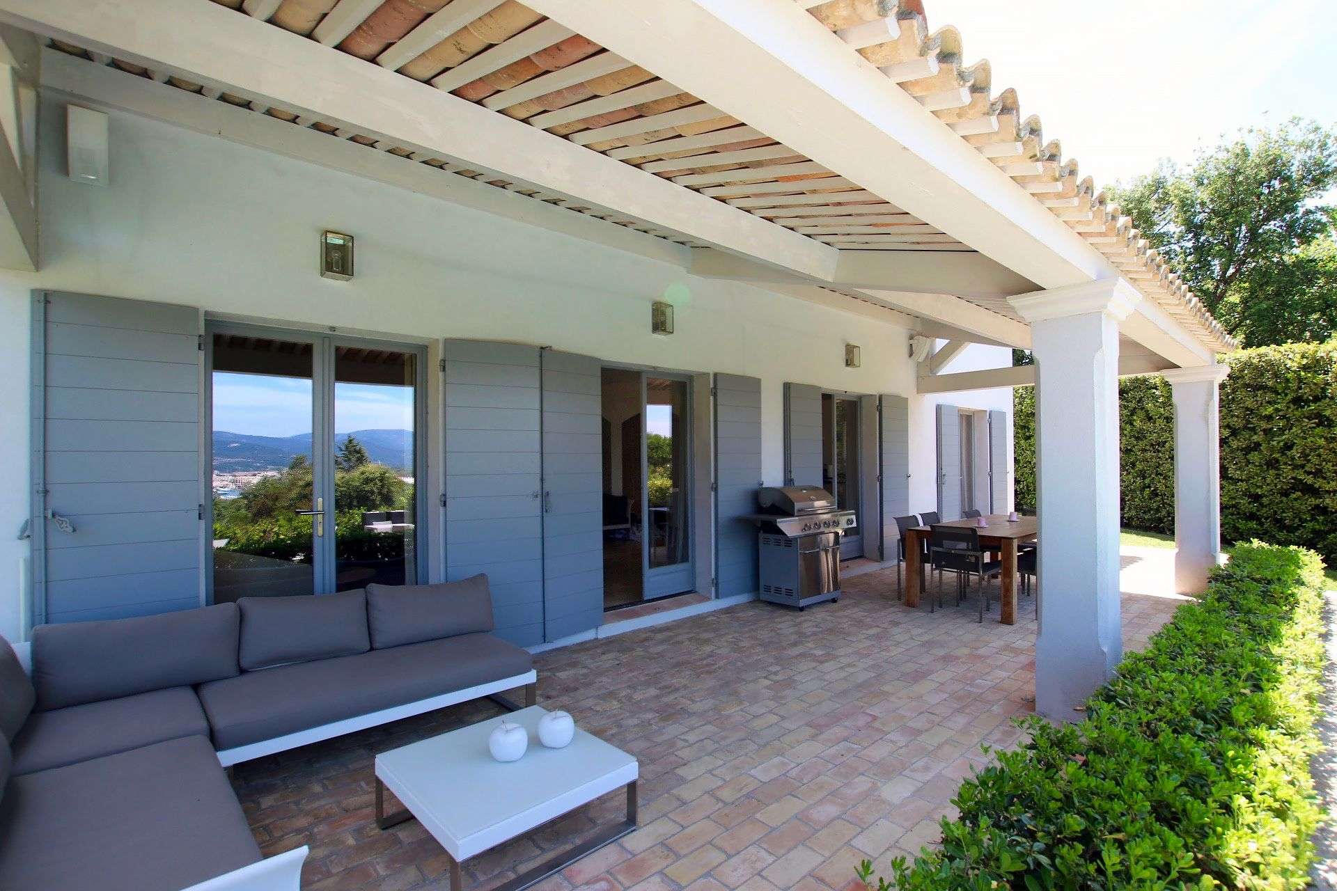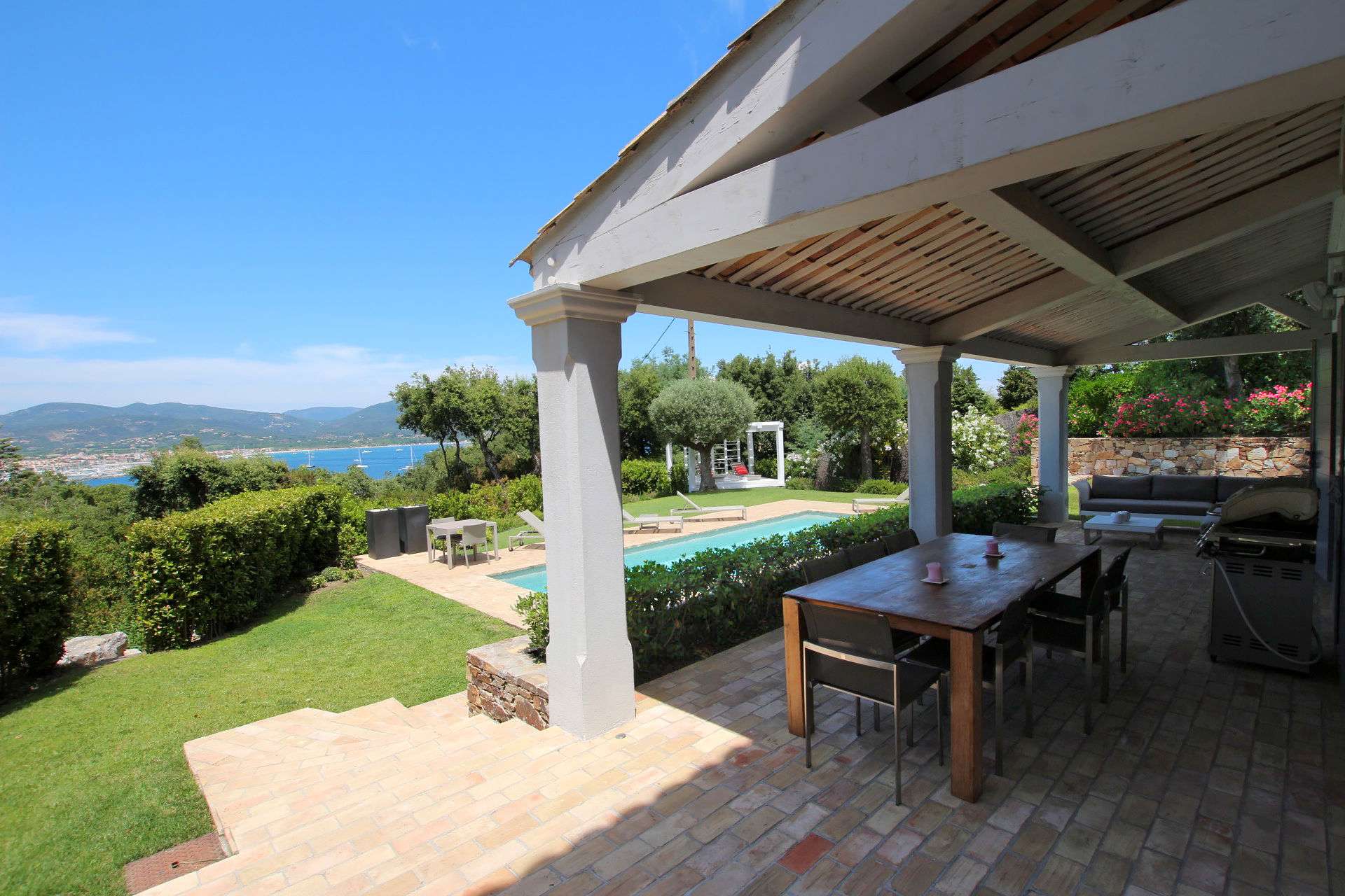 Très belle villa climatisée de 4 chambres, confortable et soignée idéalement située dans un domaine privée à 300m à pied de la mer. Accès aisé au village de Saint-Tropez et au Golf Club.
