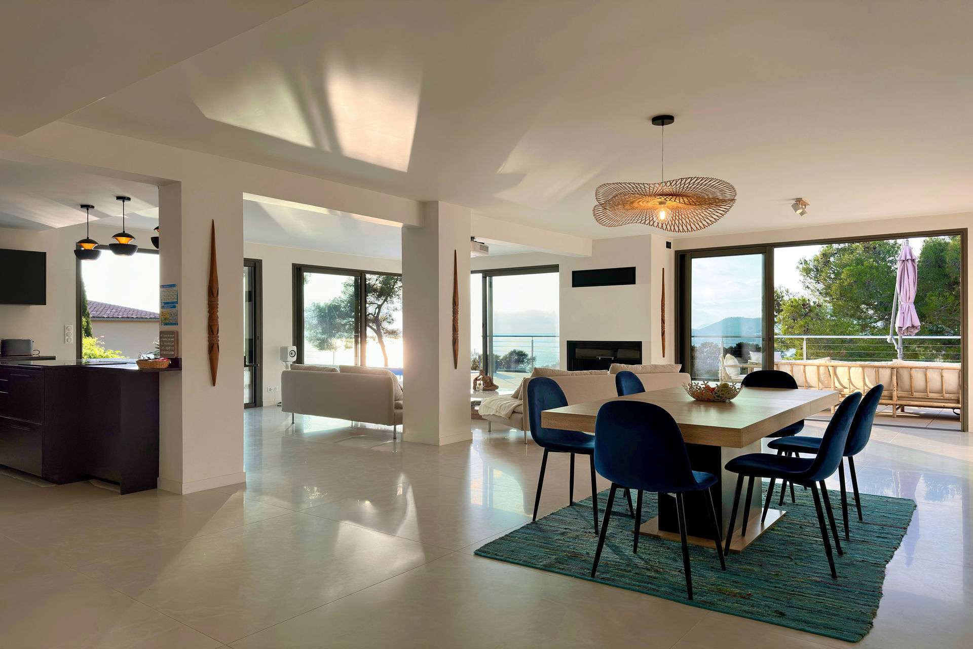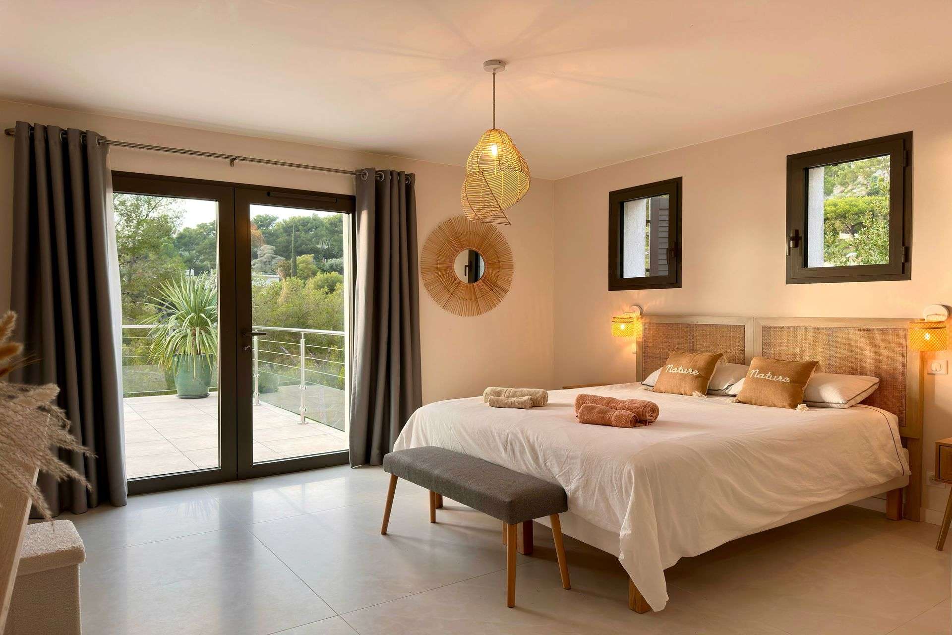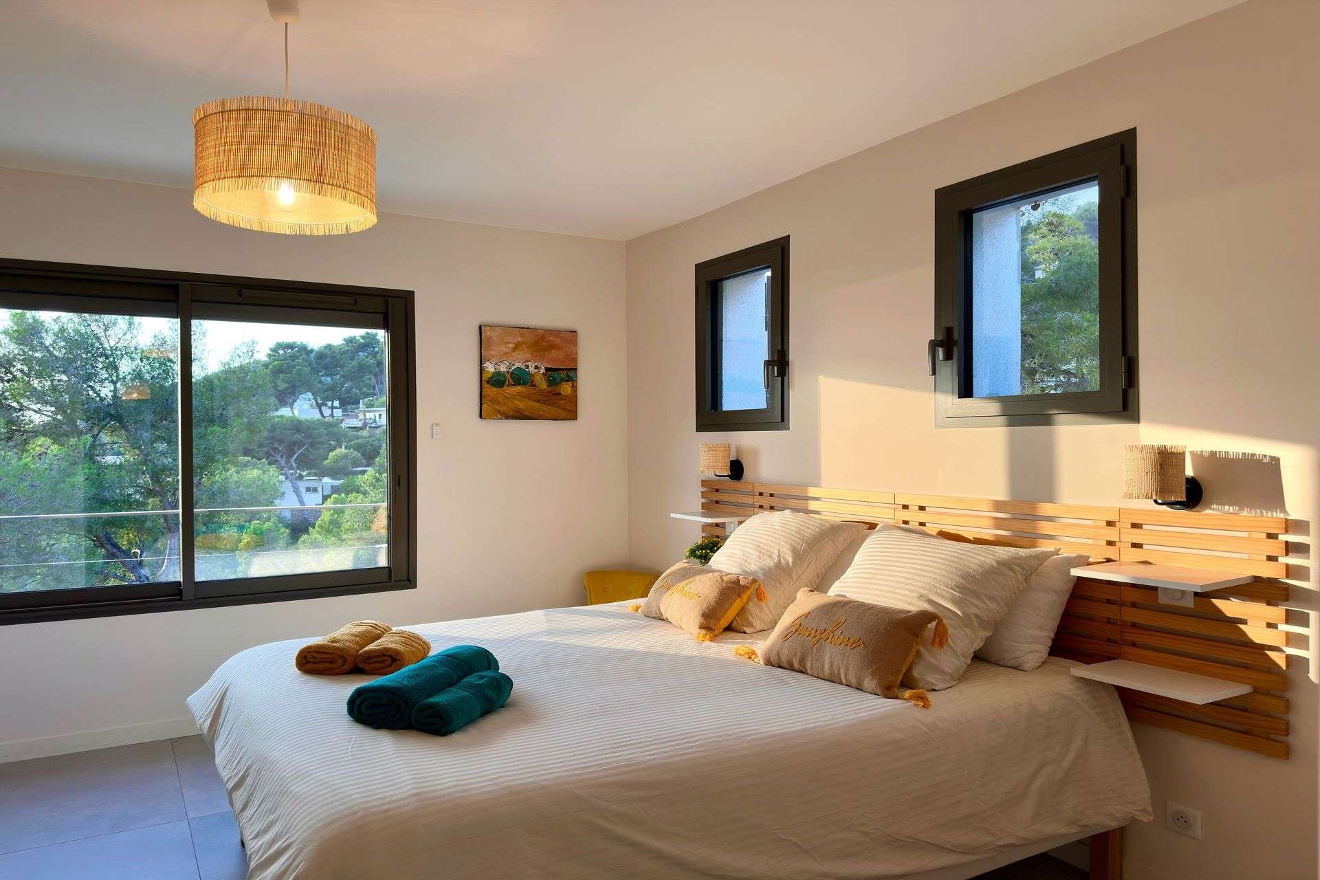 Ouverte sur la mer et orientée sud-ouest, cette villa contemporaine rénovée entièrement en 2024 bénéficie d’un emplacement privilégié dans le domaine de la Californie Varoise, proche du port de plaisance et de la ravissante presqu’île de Giens.